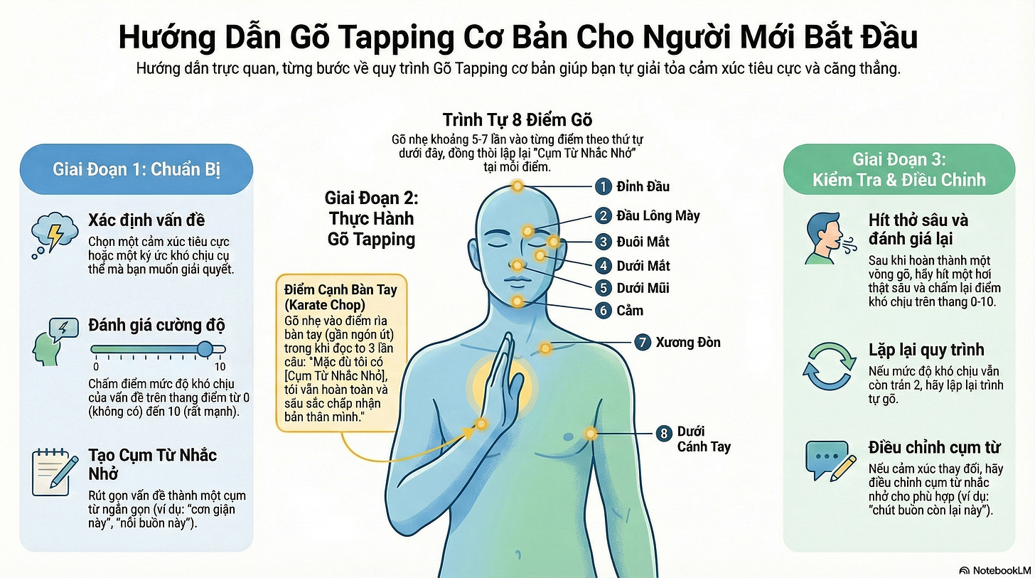 Còn Tapping? Tapping giống như những nhịp gõ nhẹ lên ống, giúp giải phóng điểm nghẽn để dòng nước chảy lại tự nhiên. Nó không thay thế cảm xúc; nó mở đường cho cảm xúc được di chuyển, xử lý và hòa tan theo đúng cơ chế sinh học của cơ thể.
